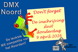 Zaterdag 11 april 2026 is de DMX Noord wedstrijd bij MSV Motordrenthe in Westerbork.Let op, omdat de wedstrijd op zaterdag is, kan inschrijven tot en met donderdag 9 april 2026. Vrijdag of de wedstrijddag op zaterdag is inschrijven niet meer mogelijk! Inschrijven kan alleen digitaal via Inschrijven. |